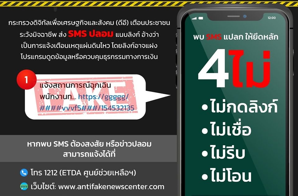 กระทรวงดิจิทัลเพื่อเศรษฐกิจและสังคม (ดีอี) เตือนประชาชน ระวังมิจฉาชีพ ส่ง SMS ปลอม แนบลิงก์ อ้างว่าเป็นการแจ้งเตือนเหตุแผ่นดินไหว โดยลิงก์อาจแฝงโปรแกรมดูดข้อมูลหรือควบคุมธุรกรรมทางการเงิน